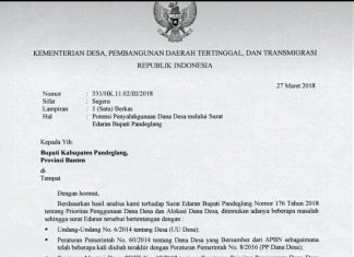 KEMENTERIAN Desa, Pembangunan Daerah Tertinggal, dan Transmigrasi (Kemendesa PDTT) melayangkan surat “teguran” kepada Bupati Pandeglang, Irna Narulita. Surat bernomor : 33/HK.11.02/III/2018 pada 27 Maret...