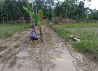 PEMUDA Kecamatan Sindangresmi Kabupaten Pandeglang menanam pisang di tengah jalan kubangan kerbau menuju kampung mereka, Senin (24/09/2018). Aksi tersebut merupakan bentuk protes mereka terhadap...