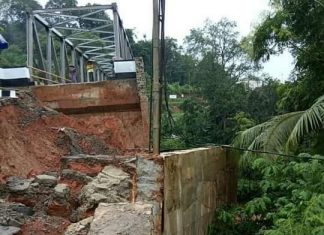TANAH di bibir jembatan yang mengubungkan Desa Muara Dua, Kecamatan Cikulur dengan Kampung Leuwijaksi, Desa Margatirta, Kecamatan Cimarga Kabupaten Lebak, Banten, Rabu (26/12/2018) sekitar...