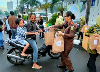 KEJAKSAAN Negeri Pandeglang bersama para wartawan Pandeglang, membagikan sebanyak 500 paket kepada pengendara yang melintas di depan kantor Kejaksaan Negeri Pandeglang, pada Selasa (29/3/2023).