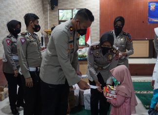 PERINGATI Hari Ulang Tahun Polantas ke-66, Satlantas Polres Pandeglang menggelar santunan kepada 20 anak yatim piatu, di Aula Mapolres Pandeglang, Rabu (22/9/2021).