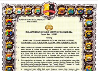 KAPOLRI Jenderal Pol Idham Azis menerbitkan maklumat bernomor Mak/1/I/2021 tentang Kepatuhan Terhadap Larangan Kegiatan, Penggunaan Simbol dan Atribut serta Penghentian Kegiatan Front Pembela Islam...