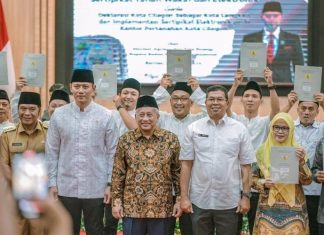 SERANG - Wakil Ketua DPRD Banten M. Nawa Said Dimyati menghadiri acara Penyerahan Sertipikat Tanah Wakaf serta Deklarasi Kota Cilegon sebagai Kota Lengkap Spasial...