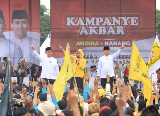 KETUA DPP Partai Golkar Airin Rachmi Diany turut memberi semangat tim pemenangan dan massa kampanye akbar pasangan calon bupati-wakil bupati Serang Andika Hazrumy-Nanang Supriatna...