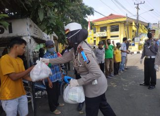 SATUAN Lalu Lintas Polres Pandeglang membagikan ratusan paket sembako, masker dan hand sanitizer kepada warga di sejumlah lokasi di perkotaan Pandeglang, Jumat (10/04/2020).